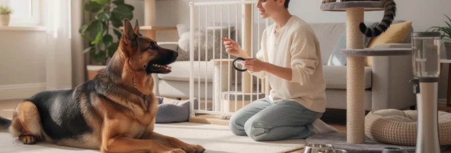 Les barrières physiques sont un outil central des protocoles d’introduction entre Berger allemand et chat. Elles permettent de gérer la distance, d’éviter tout contact brutal et d’offrir au félin un sentiment de contrôle de la situation. On peut utiliser des barrières bébé à barreaux, des portes grillagées ou des panneaux amovibles qui laissent passer les odeurs et les sons tout en empêchant le chien de foncer sur le chat. Pour ce dernier, des espaces sécurisés en hauteur (étagères, meubles, arbres à chat) doivent être accessibles à tout moment.